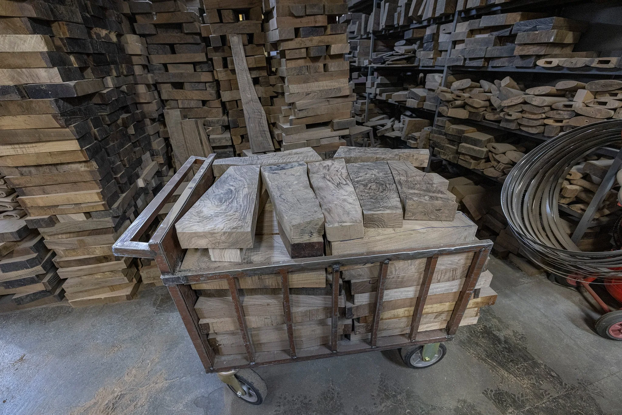 Putting his back into opening the sliding side door of an unassuming building, we were greeted by row upon row of rich walnut blanks from field grade to exhibition level, skillfully layered in massive Jenga-like stacks to allow airflow as the dried and stabilized wood waited to be shaped. Behind was a crypt-like kiln, ready and waiting to process this most recent shipment.