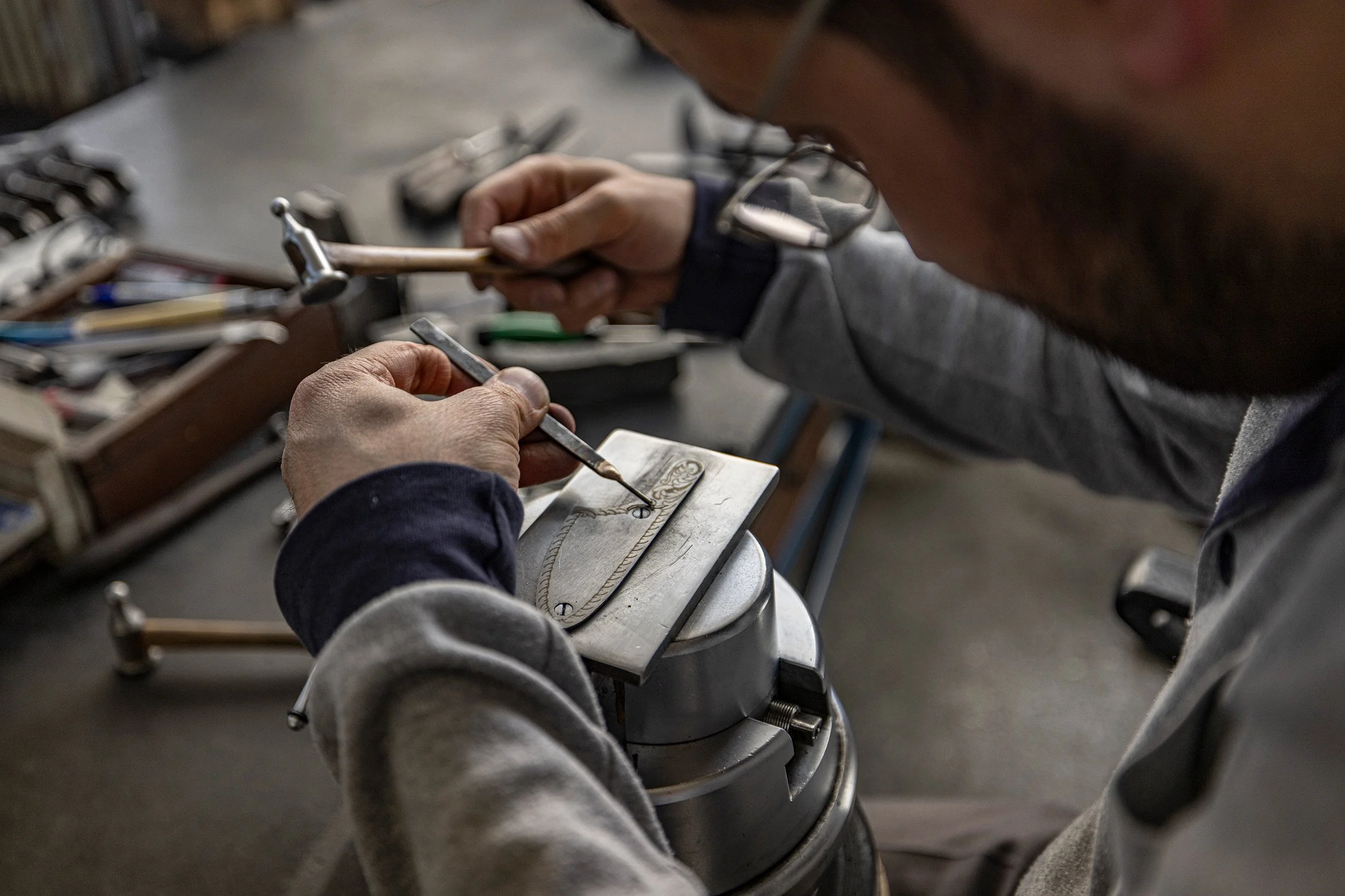Stepping back into the workshop, we made our way upstairs to a corner room with some of the best views in the building – though no one there so much as paused to take them in. Heads down and focused, a mix of men from their 30s to their 60s worked with hammer and fine chisel to engrave actions, sideplates and forearm metal.