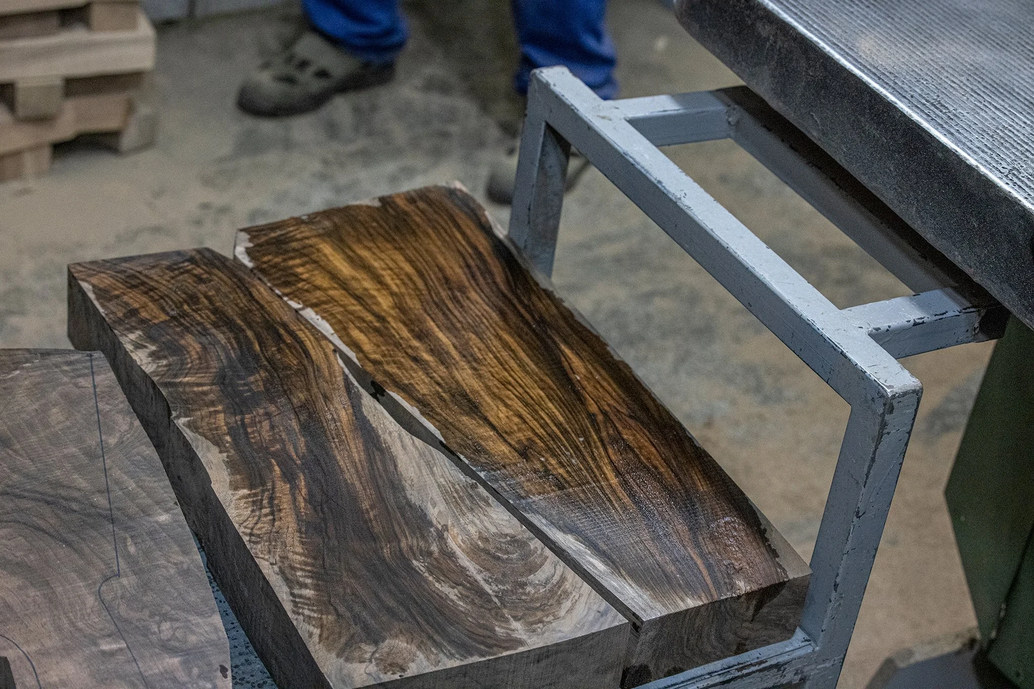 Going from stack to stack, Joel picked up a slab of wood with just a hint of fiddleback – barely visible in the rough surface of the walnut. Stepping over to the beam of light coming in the side door, he started to rotate it in the sun when a worker produced a bottle of water and gave it a spritz of moisture – making the grain and figure absolutely come to life.