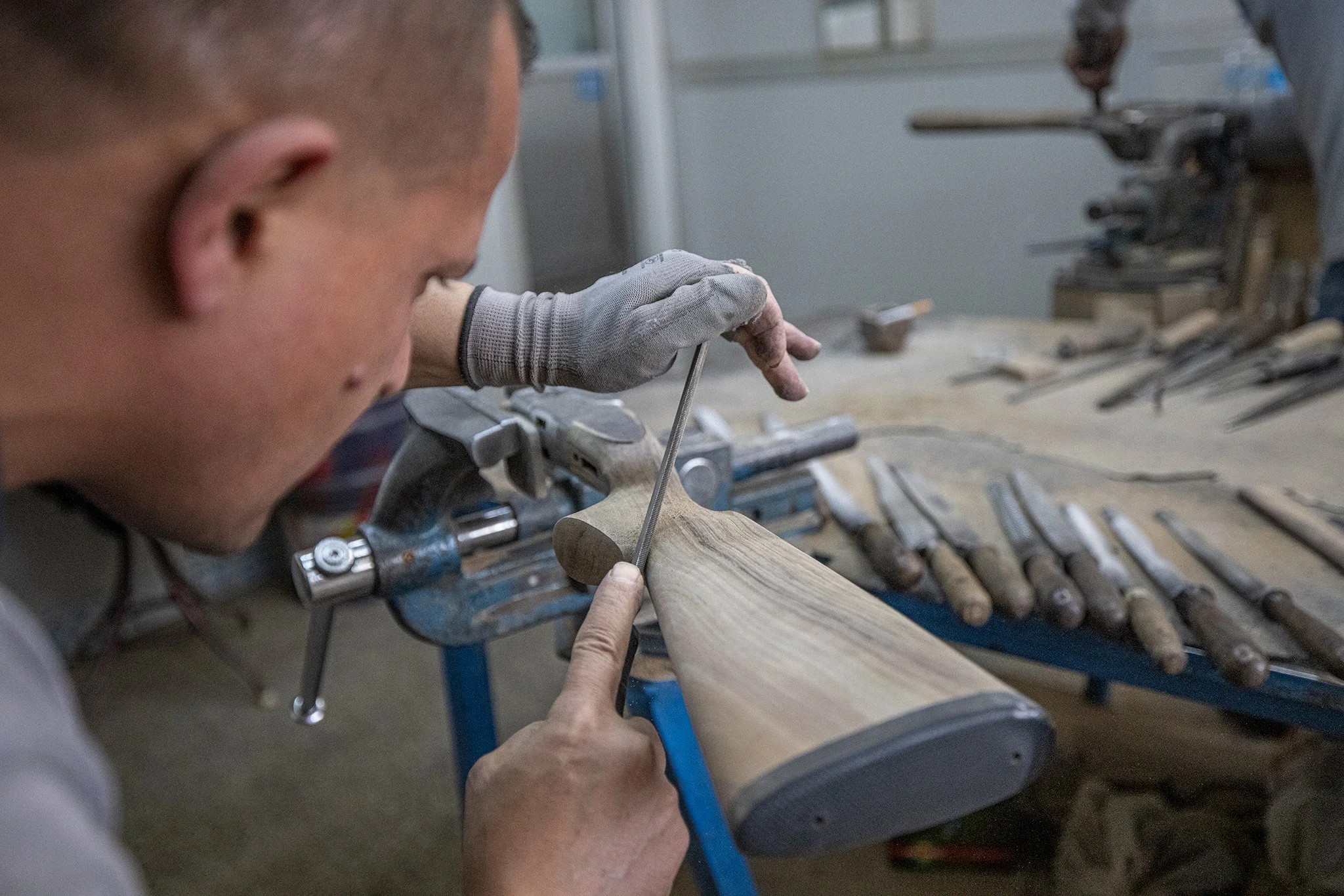 Roughly-shaped stocks were deftly mated to the metalwork that would forever ride within them, then metal and wood alike met with craftsman after craftsman as they were refined down to their finished form.