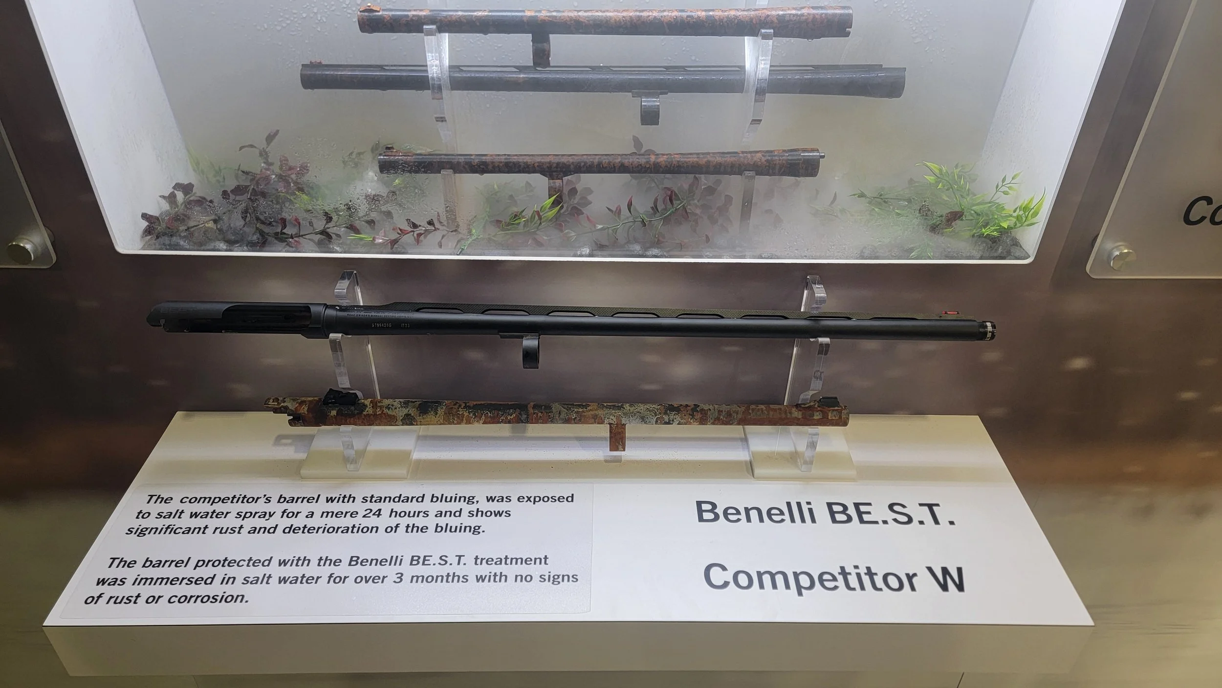 In Benelli’s SHOT Show booth is a display with constant salt spray, showing their finish compared to the competition – the others turning rather crusty!