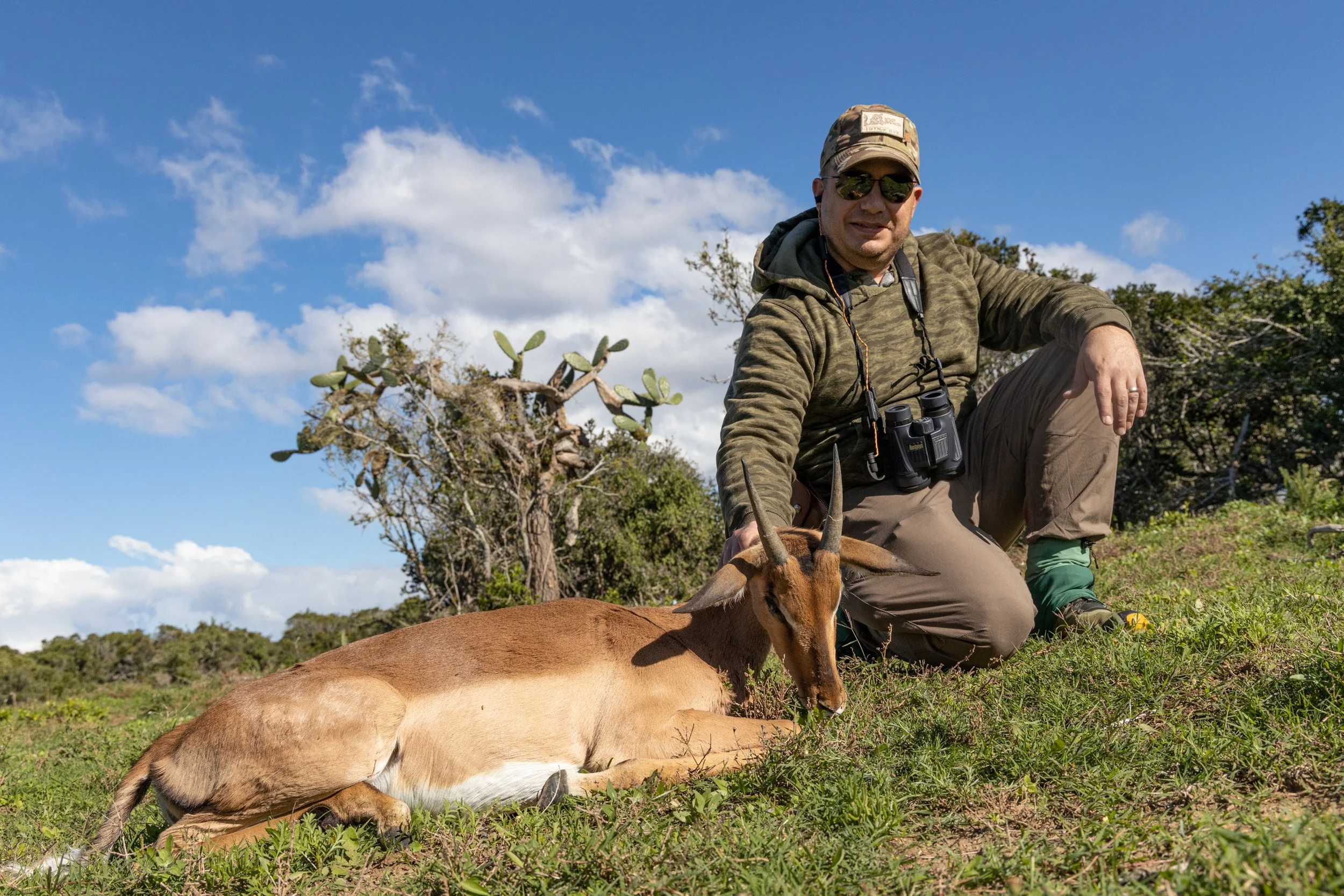 Sliding off the two-track and hiking up a rise, Gavin followed the PH to the edge and a moment later the report of the little Sauer echoed through the bottom. A first safari rifle had taken a first safari critter.